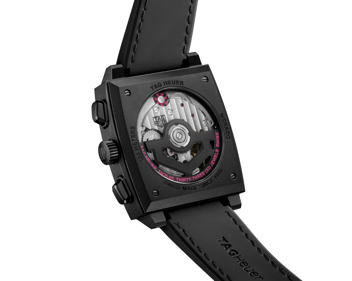 直徑39mm的錶殼採用二級鈦金屬錶殼,表面經黑色DLC鍍層處理。3時與9時位置的小錶盤、小錶盤指針、中央計時秒針、時標,都點綴上鮮亮奪目的粉紅色。透過藍寶石水晶底蓋,可欣賞到此錶款所搭載的Calibre Heuer 02 自動上鍊機芯配備飾有粉紅色字樣的擺陀,位在12時位置的導柱輪也是以粉紅色呈現,呼應拉斯維加斯活力四射的夜間景緻。