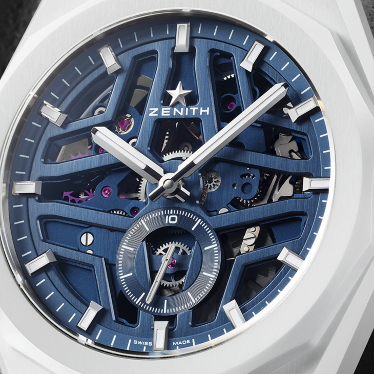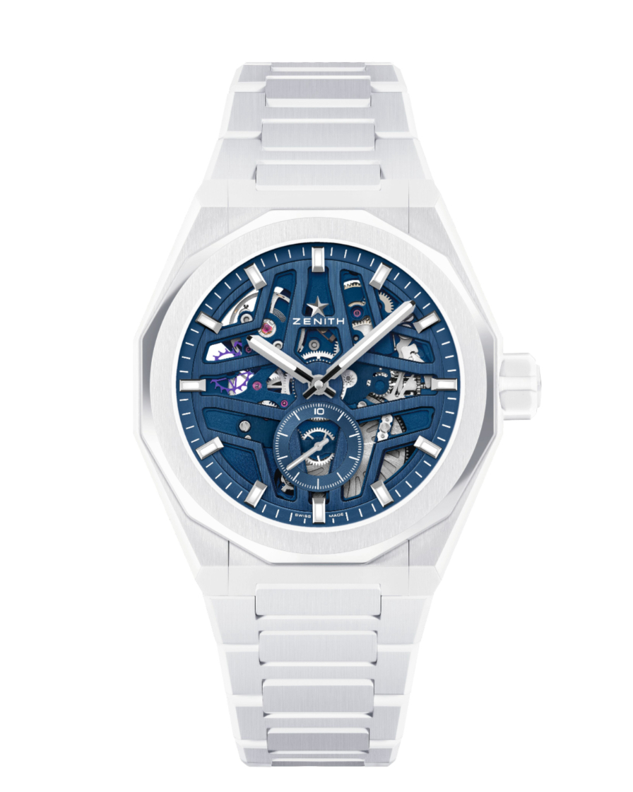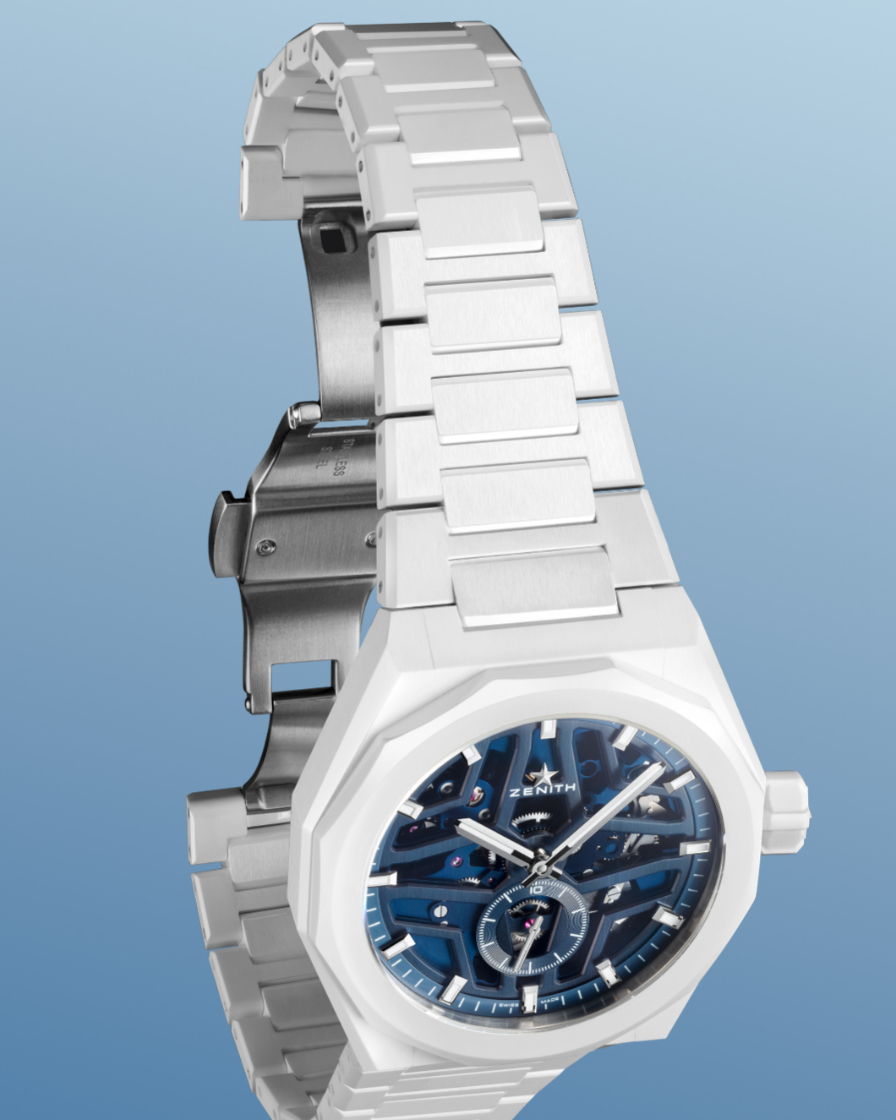 白色陶瓷錶殼擁有交替的緞面打磨與拋光表面,搭配標誌性的十二邊形錶圈,防水深度達100米。藍色鏤空錶盤隨光線變化顯現不同的藍色調,並採用了ZENITH從1969年起使用的著名四芒星設計。錶盤6點鐘位置設有全球首創且唯一的恆定速度1/10秒顯示,每10秒旋轉一圈。
