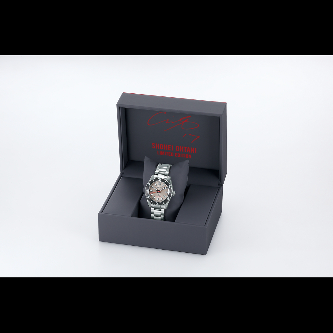 這款Prospex Diver Scuba大谷翔平2023限定版SBDC191,為灰色面盤搭配黑色錶圈,錶冠裝飾大谷翔平的背號「17」、紅色秒針是大谷翔平效力的天使隊制服顏色、不鏽鋼錶扣刻有大谷翔平的簽名筆跡,錶款限量1,700只,同樣是呼應他的背號。錶款預計於2023年8月11日起開始在日本販售,定價為日幣187,000円。