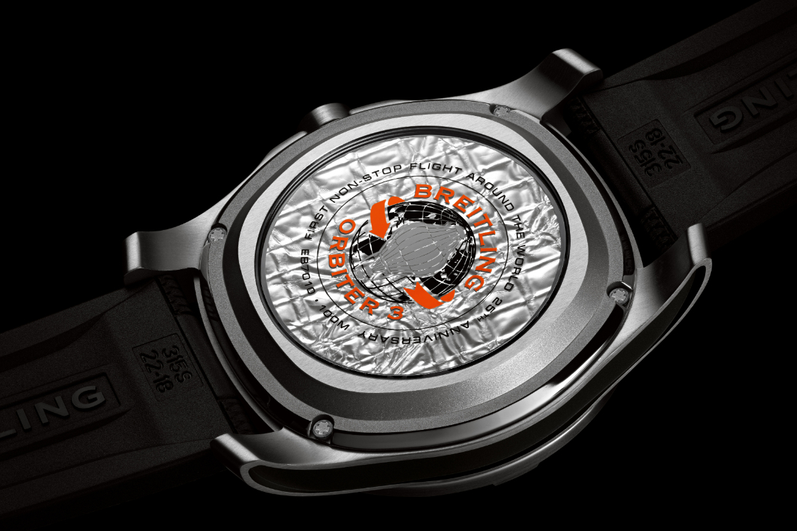 極富紀念意義的不只錶盤,還有錶背,每一只錶的透明底蓋下均封存了一塊銀色的Orbiter 3熱氣球碎片,四周還飾有任務徽標,並鐫刻有「First non-stop flight around the world 25th anniversary(首次不間斷環球飛行25周年)」的字樣。腕錶內部搭載獲COSC瑞士官方天文台認證的B70 SuperQuartz™溫度補償超級石英機芯,具備飛返計時、倒數計時器、雙時區、單圈計時和萬年曆等功能。