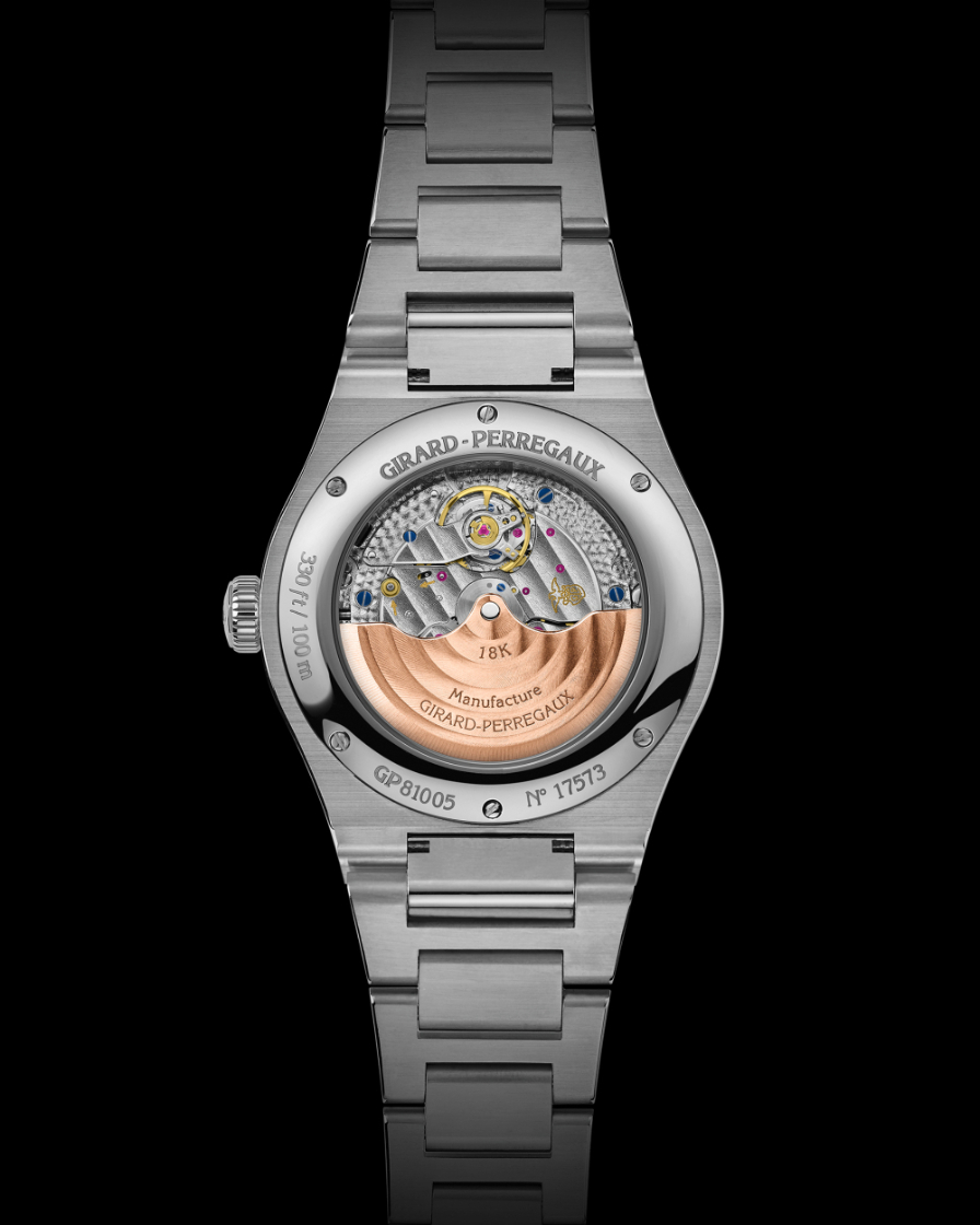 僅10.02mm厚的纖薄錶殼內,搭載GP03300自動上鍊機芯,動力儲存至少46小時,翻轉至錶背,即可見機芯豐富而精湛的細節,其主夾板飾以珍珠圓紋打磨,其他零件則經過倒角、鏡面拋光、磨砂、蝸形紋、太陽放射紋以及多種鐫刻工藝加工處理,橋板和玫瑰金擺陀分別飾以直線形和圓環形的日內瓦紋。