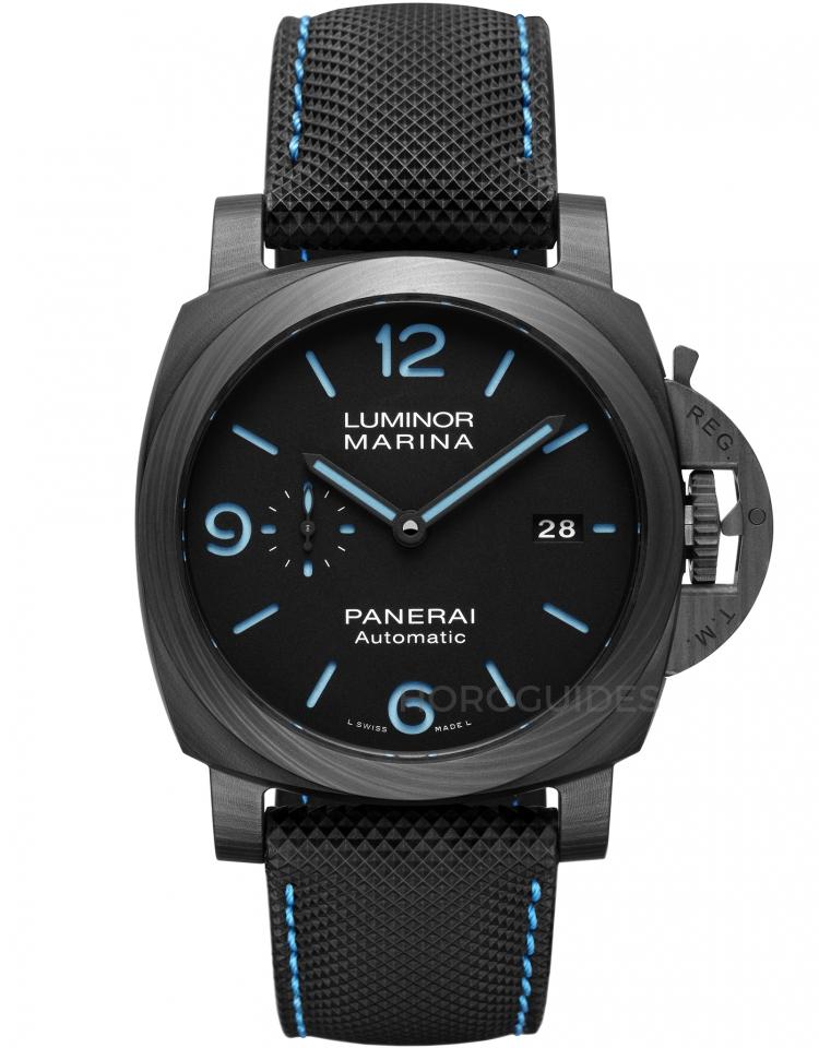 使用Carbotech碳纖維材質錶殼的PAM1661是發表後詢問度就頗高的款式,面盤的藍黑配色與2017年話題錶LAB-ID相當類似。由於錶殼為碳纖維、實底蓋為鈦金屬,佩戴上手手感輕盈,沒有大尺寸款式的沉重感。藍色夜光塗料為綠色夜光顯示,搭配襯有藍色縫線的Sportech錶帶,是市場的熱門款。