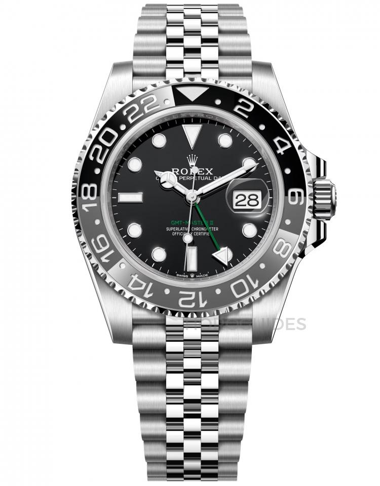 這是勞力士雙色陶瓷圈有史以來最低調的款式。灰色和黑色陶瓷雙色Cerachrom錶圈內填銀色鉑金刻度,搭配黑色面盤,完整的monochromatic灰階色調,襯出綠色的第二地時間指針以及錶盤六點鐘GMT-Master II字樣特別顯眼,更與2007年的116710LN十分相像。錶款一次推出Oyster蠔式帶與Jubilee五珠帶,配備Easylink鍊節。雖然可能並不亮眼,卻是系列不可或缺的基本配色。對比2023年同樣是灰黑圈,但為黃金材質錶殼與two-tone間金材質的款式,視覺效果非常不同。