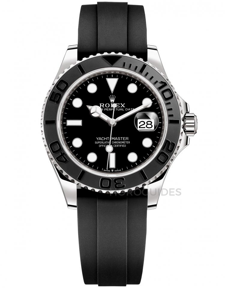 線上款式均為貴金屬材質的Yacht-master擁有極為運動的風格外觀,再者身為品牌第一個搭配oysterflex橡膠錶帶的系列,奠定了系列奢華運動錶的定位。此款以白金錶殼搭配黑色錶盤,黑色陶瓷錶圈以霧面背景搭配立體的亮面數字刻度,內行錶迷一眼就會看出黑白基本配色之下的尊貴身價,適合喜愛低調奢華的藏家。