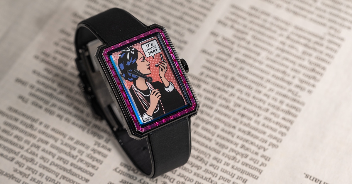 錶殼採黑色塗層精鋼打造,錶圈鑲嵌38顆長階梯形切割粉紅藍寶石。錶盤上所呈現的高彩度色彩圖騰,是由J.P. Journe 旗下的面盤廠Les Cadraniers de Genève所製作,工匠運用小刷子手工將液態琺瑯塗覆在18K白金錶盤上,經重複數次並在攝氏800°下燒製錶盤,以達到理想顏色飾面的粉紅網點背景。而香奈兒女士的輪廓和細節則以油墨或大明火琺瑯結合12個移印模手工轉印至錶盤上,每一道貼花之間,油墨在攝氏50°下放置2小時待乾。每個移印模均由 CHANEL腕錶創意工作室所設計並對應特定的顏色和主題如:香奈兒女士的黑色輪廓、米色皮膚、藍色頭髮、紅色指甲油、白色元素……等。