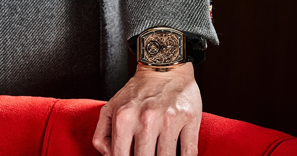 2014年問世的 Vanguard 系列和1987年問世的經典 Cintrée Curvex 相同,都採用黃金比例的酒桶造型錶殼,但是輪廓的勾繪與種種細節的描述,都讓 Vanguard 系列散發出迥異於 Cintrée Curvex 的氣質,更俐落更具現代感的型格,這與系列作為高級運動腕錶的設定有關。同時 Vanguard 系列的殼型相當碩大,提供了充裕的空間讓品牌能夠在這個系列上進行各種創作。尤其像是前幾年問世具備超大陀飛輪的Gravity,還有這次要介紹的三問鏤空陀飛輪腕錶,都能在 Vanguard 系列上盡情揮灑。