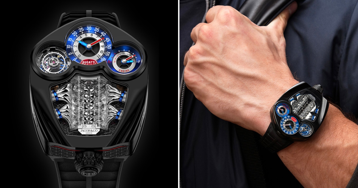 Jacob & Co.將Bugatti頂級車款Tourbillon的機械結構與流線外觀,全面解構再詮釋,化為戴著走的超級引擎。引人矚目的V16氣缸引擎自動裝置,是為呼應Bugatti Tourbillon超級跑車的全新獨創引擎所設計,以一整塊藍寶石打造而成,並在上面鑽孔、安裝上16個鈦金屬微型活塞;這些活塞由單一軸心的曲軸所驅動,當自動裝置啟動時,曲軸旋轉、16個氣缸同時上下運作;由錶冠中間的按鍵啟動後,V16引擎模塊自動裝置將連續運作20秒。面盤造型與Bugatti超跑儀表板的設計系出同源,左側設置了30秒飛行陀飛輪,右側小錶盤同時指示機芯與V16氣缸自動裝置的動力儲能,中央錶盤顯示小時與分鐘。