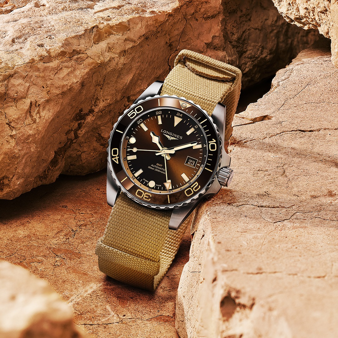 備受錶迷喜愛的LONGINES浪琴表HydroConquest,全新推出兩地時間功能!HydroConquest GMT不鏽鋼錶殼錶徑41mm、配備單向旋轉陶瓷錶圈、防水300米。錶款配色包括棕面棕圈、綠面黑圈、黑面黑圈以及藍面藍圈四種,並可選擇搭配金屬鍊帶、Nato錶帶或是橡膠錶帶。